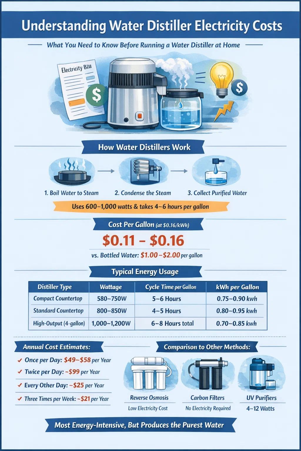 Chun tomhaltas leictreachais driogairí uisce a thuiscint, cuidíonn sé fios a bheith agat cad atá á dhéanamh acu laistigh. Feidhmíonn an próiseas driogtha trí uisce a théamh go dtí a fhiuchphointe - 212°F (100°C) — é a iompú ina ghal, an gal sin a chur trí chorna fuaraithe, agus ansin é a chomhdhlúthú ar ais i bhfoirm leachtach i gcoimeádán glan bailithe. Fanann gach rud a tuaslagadh san uisce bunaidh - mianraí, miotail throma, baictéir, an chuid is mó de na ceimiceáin - sa seomra fiuchphointe.