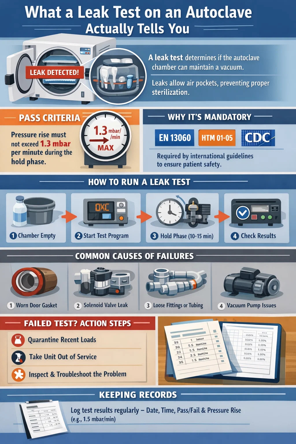 Níor cheart an t-autoclave a úsáid le haghaidh steiriliú ionstraimí othar go dtí go gceartófar an locht agus go mbaintear amach tástáil sceite pas. Má tá an dara autoclave ag an gcleachtas, aistrigh chuige. Mura bhfuil, cuir do phlean teagmhasach d’athphróiseáil ionstraimí i bhfeidhm — d’fhéadfadh sé go n-úsáidfí ionstraimí aonúsáide, nósanna imeachta neamhphráinneacha a chur siar, nó ionstraimí a sheoladh chuig saoráid sheachtrach athphróiseála.