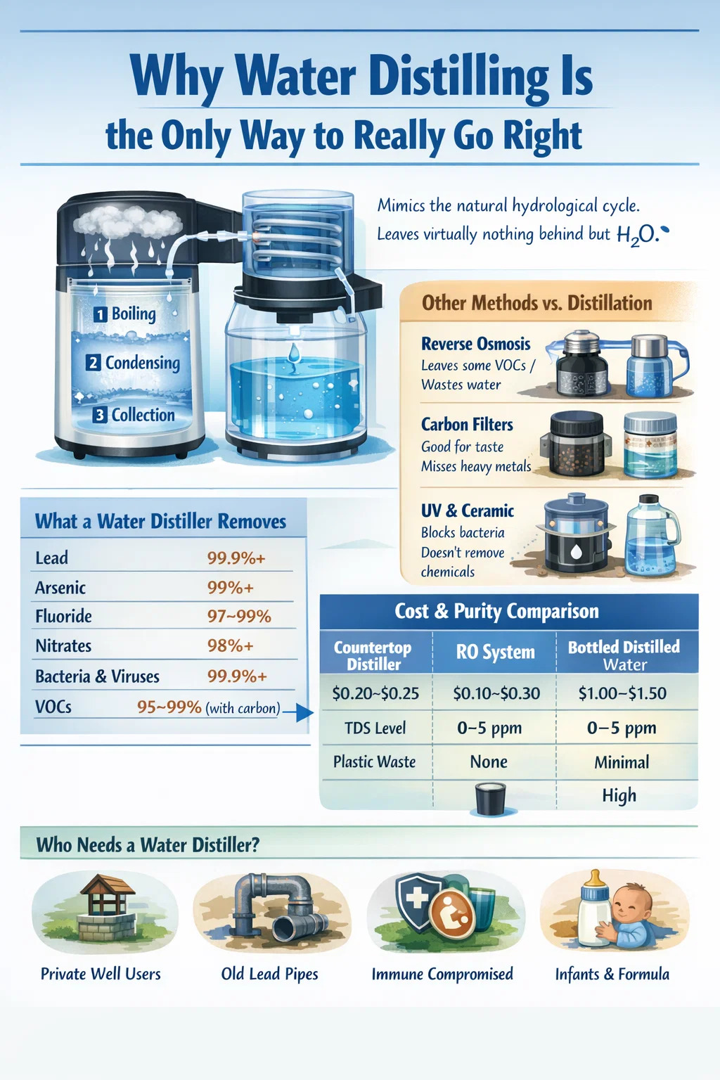Tá an croíphrionsabal simplí: téitear uisce chun fiuchphointe, ardaíonn an gaile agus téann sé trí choil fuaraithe, agus comhdhlúthaíonn sé ar ais go huisce leachtach i gcoimeádán bailiúcháin glan. Fanann aon rud nach féidir galú leis an ngalán taobh thiar de. Ciallaíonn sé sin miotail throma, salainn tuaslagtha, baictéir, víris, cistíní, níotráití, fluairíd, seachtháirgí clóirín, agus an chuid is mó de chomhdhúile orgánacha so-ghalaithe a fhágáil sa seomra fiuchphointe mar iarmhar. Tá an méid a bhailíonn tú chomh gar d'uisce íon agus is féidir leat a tháirgeadh sa bhaile nó i suíomh beag tráchtála.