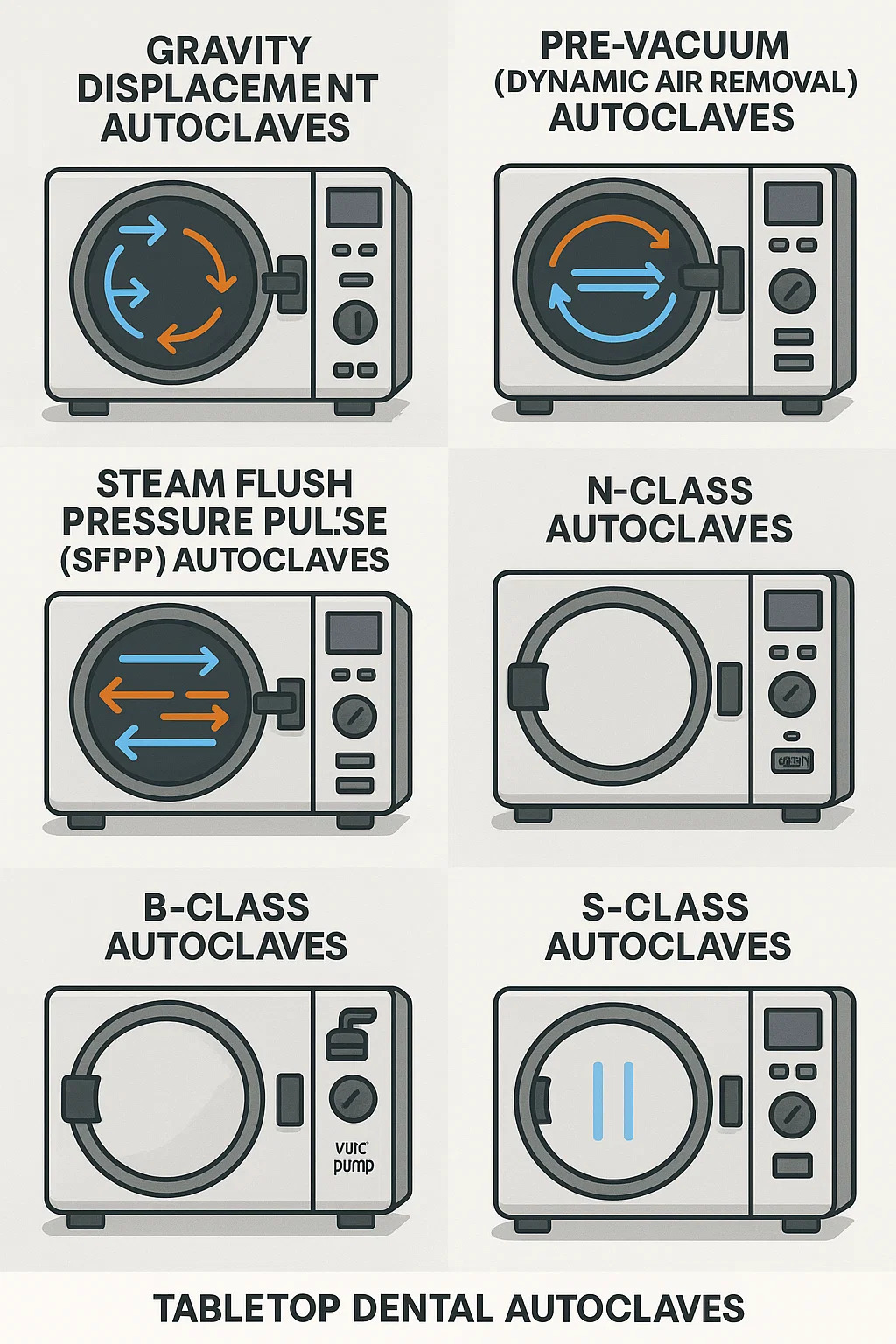 Seo iad na cineálacha príomhúla de autoclaves fiaclóireachta boird :