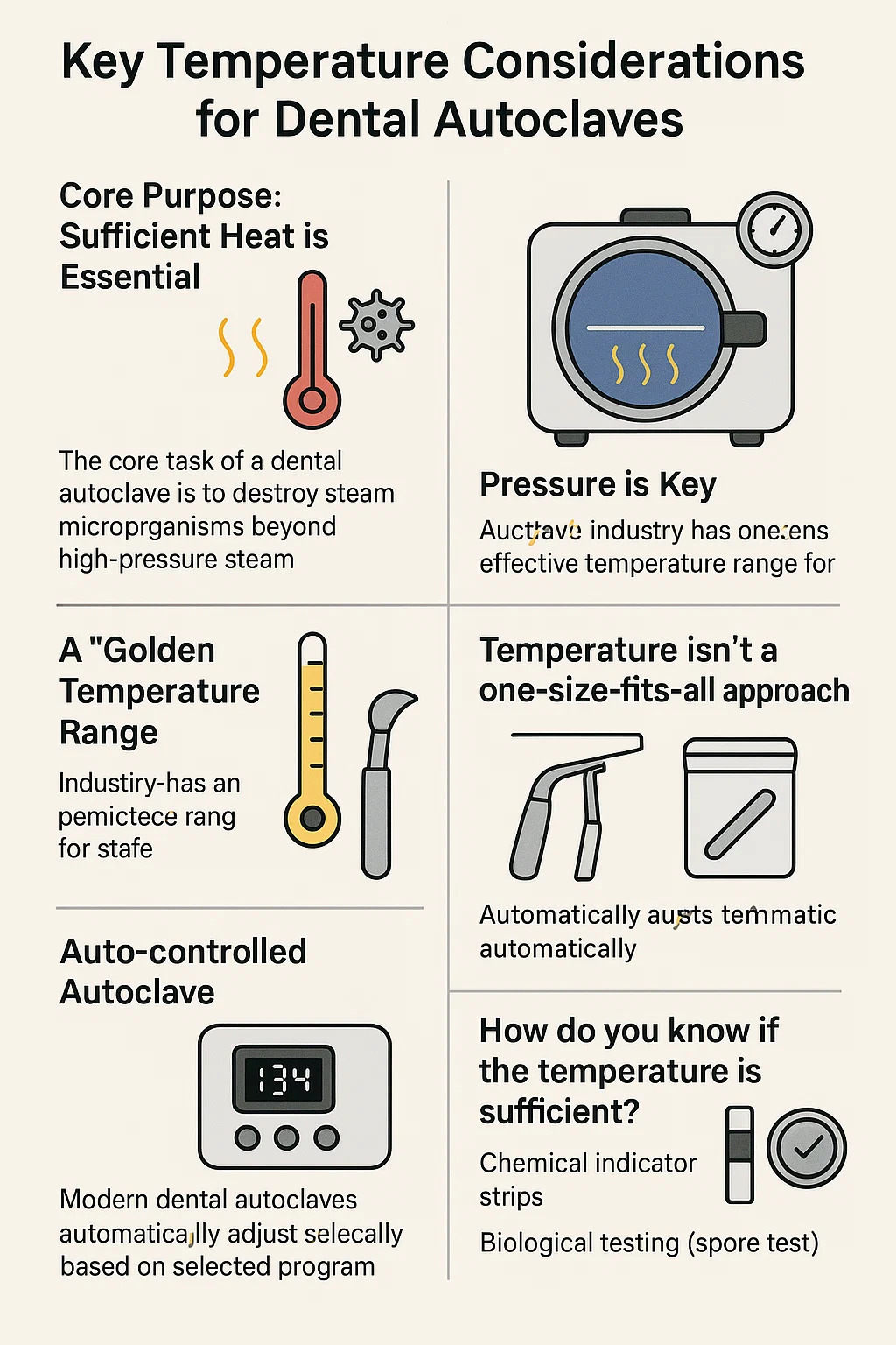 Trí chleachtas fadtéarmach, d'aithin an tionscal fiaclóireachta raon teochta atá glactha go huilíoch agus éifeachtach le haghaidh steiriliú.
